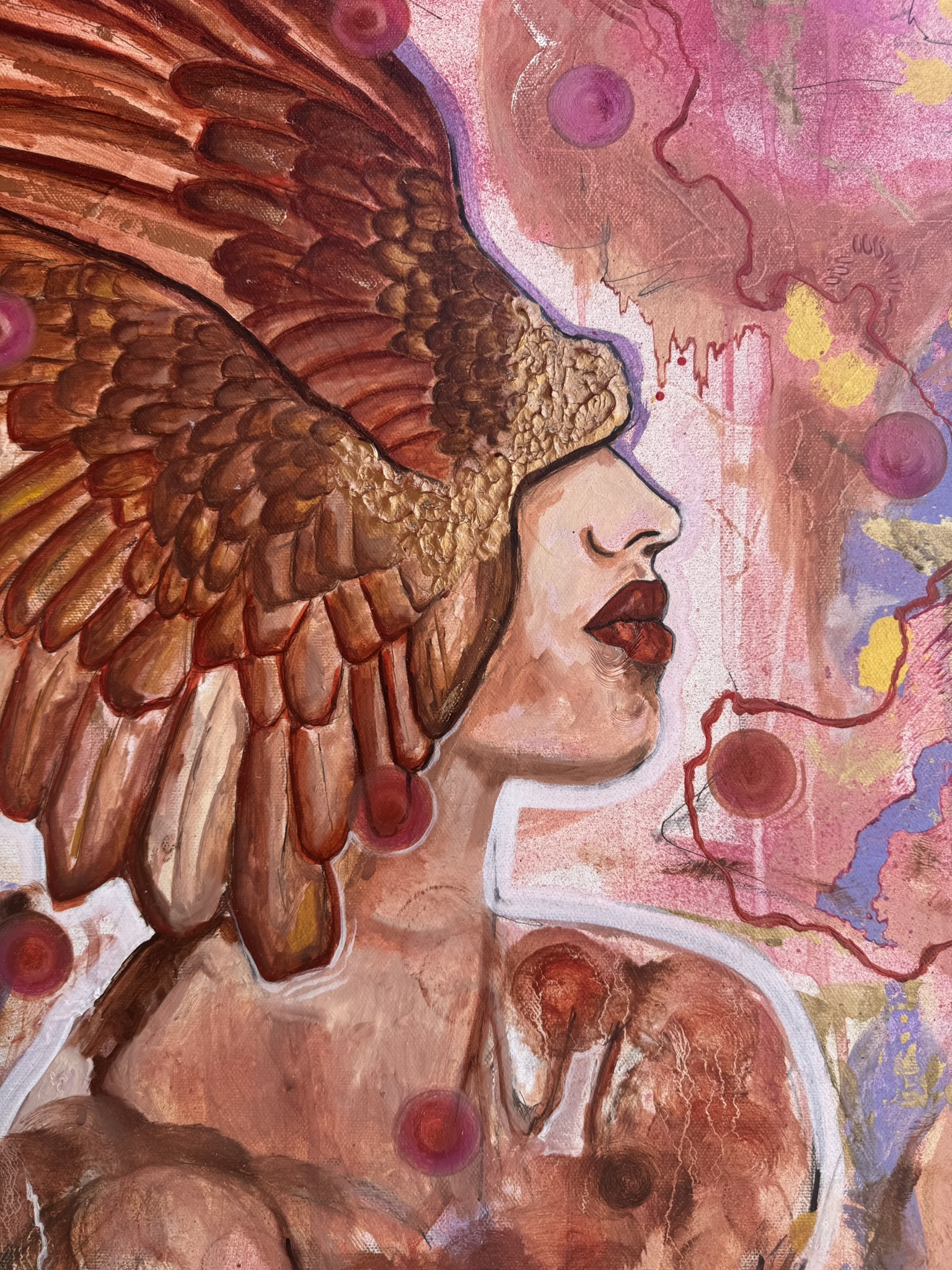 À travers une palette inspirée de la nature et des éléments, mon art explore la beauté et la force féminine en dialogue avec l’histoire, la justice, et la quête de paix.