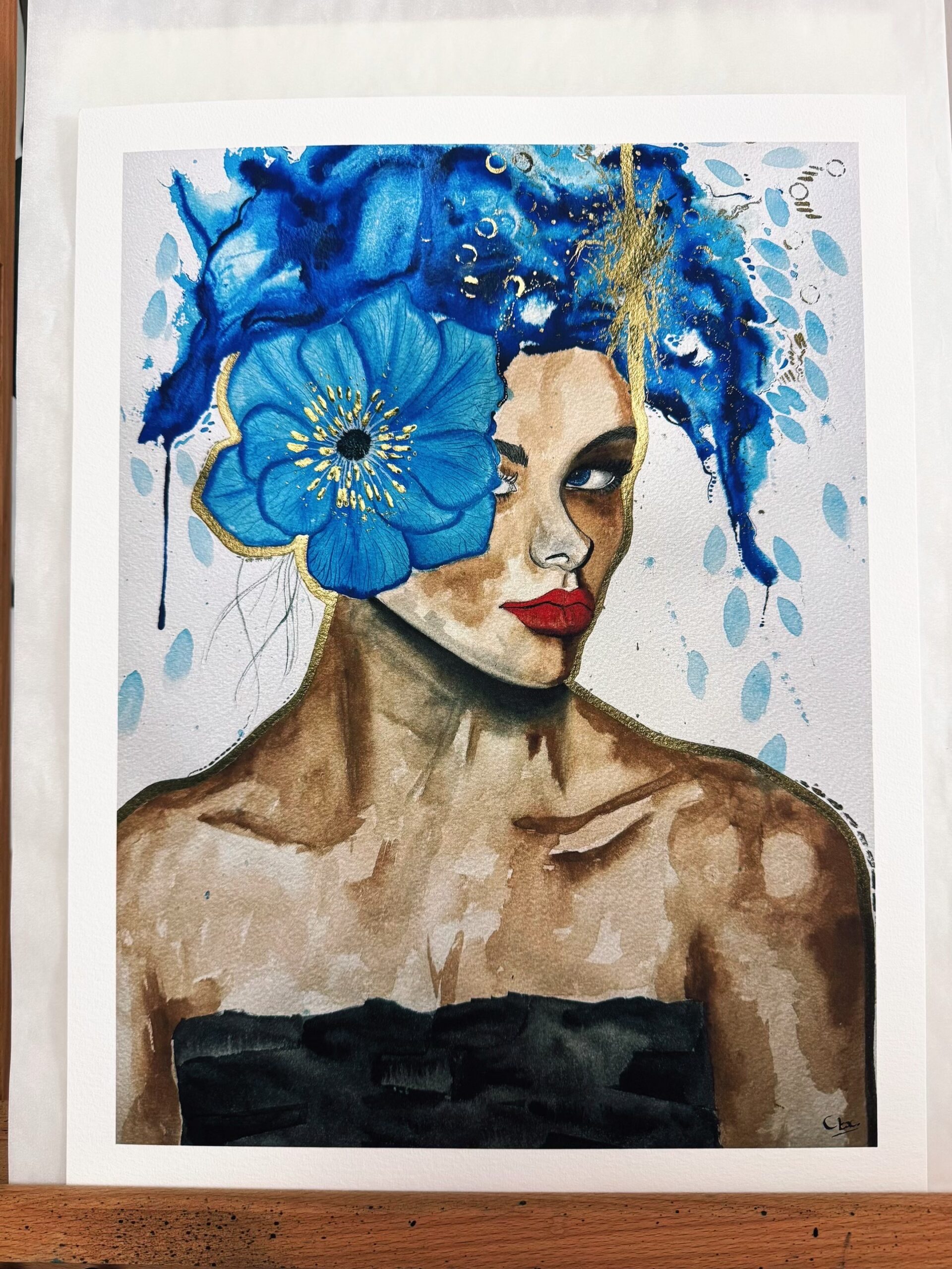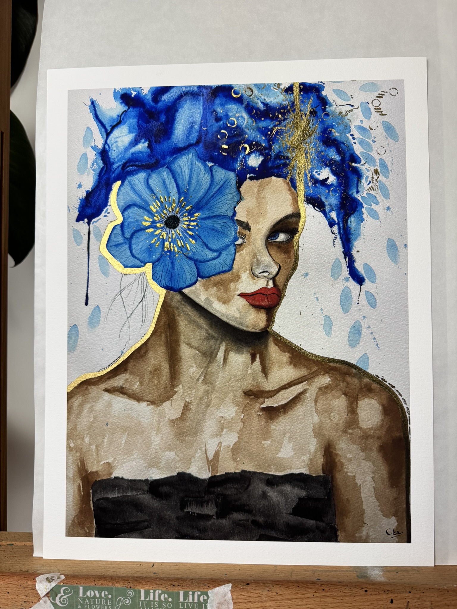 Les fleurs bleues sont les témoins de cette transformation. Elles murmurent l’importance de l’imperfection et de la vulnérabilité. Elles nous rappellent que la lumière naît souvent dans les recoins les plus sombres, là où l’on ose enfin s’aimer tel que l’on est. Le bleu, symbole de calme et d’infini, se mêle au doré, reflet de la richesse intérieure. Ce mélange illustre la force qui émerge de nos contradictions, de nos contrastes.